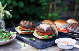 120 gr. dana burger köftesi. Sotelenmiş mevsim sebzeleri, pirinç pilavı, mini panini ekmek ile